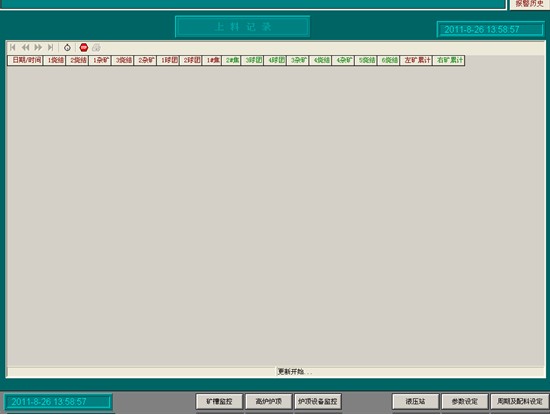 七、畫面介紹 畫面系統(tǒng)是操作人員與控制系統(tǒng)的人機界面,操作人員通過畫面對設備進行操作、監(jiān)視設備的運行情況,及時做出相應調整,畫面系統(tǒng)可以設定數據,改變運行方式,向操作人員顯示設備的正常狀態(tài)及報警信息等。 CRT畫面顯示主要內容如下: (1)系統(tǒng)畫面:熱風、布袋、礦槽、爐頂、本體儀表、爐長操爐、爐頂儀表等 (2)控制設定畫面:配料、爐頂溜槽角度、料流開度參數設定 (3)故障監(jiān)視畫面:實時顯示故障信號提示操作人員進行相應措施 (4)報警記錄:記錄各設備及儀表的故障報警 (5)報表記錄:對生產參數進行實時記錄 以下就主要畫面進行介紹 1、上料畫面: 包括整個卷楊及爐頂設備,其中主要有上料小車、左右探尺、柱塞閥、上密、下密、旋轉布料裝置、均壓閥、放散閥等。生產中可實現手動、自動隨時轉換,各種運行、故障有不同的顏色來顯示,特點1、小車拐點、卸料位等各減速點停車位可根據生產調節(jié)2、旋轉布料角度及速度可通過畫面直接設定,滿足生產工藝中的各種布料方式3、在檢修或新員工培訓情況下還可以通過畫面各種數據的設定來進行模擬生產。 圖二