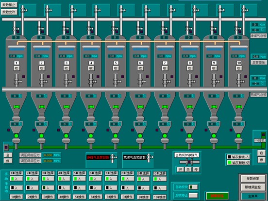 4、布袋除塵畫面 包括脈沖閥、上下卸灰閥、放散閥、上炮、下炮、輸灰機、斗提機、進出口蝶閥和進出口盲板閥,并顯示設備運行狀態(tài)、各儀表參數等。用鼠標點擊各閥們可自動彈出控制菜單,脈沖閥為動態(tài)顯示,可隨時發(fā)現因頻繁動作而損壞的電磁閥。脈沖時間及箱體選擇可根據要求設定。 在自動情況下自動完成吹掃,根據設定從1#開始依次至8號箱體。如果某個箱體出現問題會自動跳過該箱體向下執(zhí)行。 圖五
