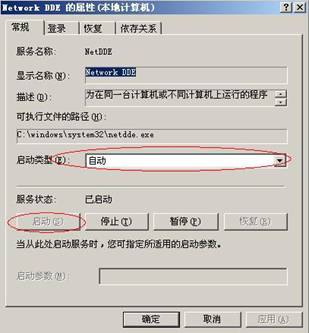 打開“控制面板”—“管理工具”下的“服務”一項,或者直接在運行中輸入“services.msc /s”打開“服務”設置。找到Network DDE DSDM,雙擊打開屬性對話框,在“常規”選項中將啟動類型改為“自動”,并啟動該服務,如下圖,Network DDE也要進行同樣的修改。