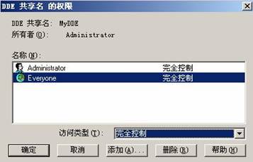 以上操作完成之后,點擊右下方的“權限”按鈕,打開“DDE共享名的權限”對話框。如下圖: