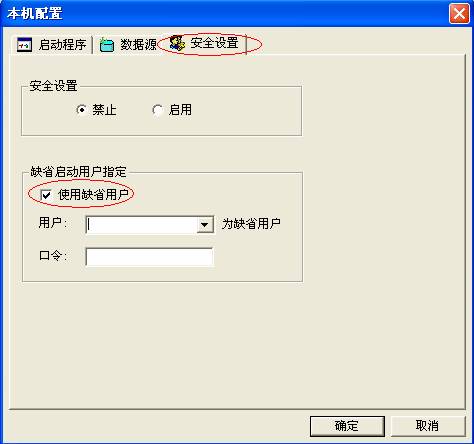 選擇“安全設置”項,,鉤選“使用缺省用戶”,并填入所用使用的用戶名和密碼,這樣系統(tǒng)啟動時就會自動使用該用戶名和密碼登陸。