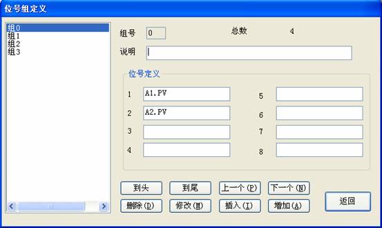步驟一:進(jìn)入工程組態(tài)。在菜單欄的“功能”菜單下有一個“位號組”選項,打開位號組會彈出一個如圖1所示的窗口,在位號定義的1至8文本框內(nèi)輸入需要編為一組的位號,然后單擊“增加”按鈕。重復(fù)上述操作,直至將所有需要查看趨勢曲線的位號都編入位號組,點擊“返回”按鈕退出位號定義對話框。