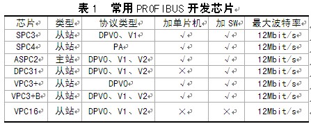 總線協議內容轉換。目前在開發DP從站的常用方案有:(1)采用單片機+PROFIBUS開發芯片;(2)直接使用帶有52內核的PROBIBUS芯片。常用的PROFIBUS開發芯片及廠家見表1所示,本文采用的開發方案是:單片機+PROFIBUS開發芯片,協議芯片負責完成數據的轉換和收發功能,單片機負責和ARD3T主體通訊,控制VPC3等。選用的協議芯片為VPC3,VPC3可直接替代SIEMENS公司的SPC3芯片,并且支持3.3V、5V電壓的工作電壓, RAM大等優點,與SPC3相比較更適合本方案使用。