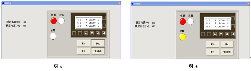 在圖7中按下停止按鈕后,主站向ARD3T發送停止指令,ARD3T控制相應繼電器斷開,分斷電機主回路,電機進入停止狀態,運行指示燈滅,三相電流顯示變為0,如圖8所示。當有故障發生時,ARD3T直接分斷接觸器,使電機停止運行,主站讀取到ARD3T中存儲的故障信息,故障指示燈亮,運行燈滅,如圖9所示。