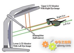 StereoMirror8482;立體鏡由兩臺AMLCD顯示器組成,它們被特殊設計的支架固定成一定角度,同時中間一面無源分光鏡將該角度平分。