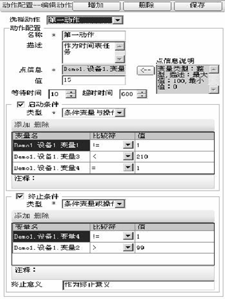2)時(shí)間表動(dòng)作描述:每個(gè)時(shí)間表任務(wù)中包含多個(gè)動(dòng)作,可以新增、修改、刪除動(dòng)作。每個(gè)動(dòng)作有動(dòng)作的名稱,有動(dòng)作點(diǎn)信息和動(dòng)作值。在一般情況下,動(dòng)作信息按照時(shí)間條件執(zhí)行;在有些特殊情況下,除了時(shí)間條件,動(dòng)作執(zhí)行需要一個(gè)啟動(dòng)條件和終止條件。啟動(dòng)和終止條件需要選擇相關(guān)的點(diǎn)信息和條件值。