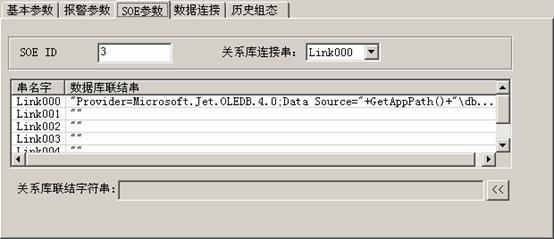 在紫金橋SOE點(diǎn)里面預(yù)定義了一個關(guān)系庫連接串,就是 Link000 ,該串是連接到工程下面的預(yù)設(shè)的 access 庫中。如果用戶,沒有自己定義關(guān)系庫,那么默認(rèn)就是Link000 連接串。