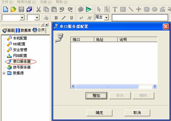 進入開發(fā)環(huán)境,在導(dǎo)航樹中選擇“公共/串口服務(wù)器”并單擊,出現(xiàn)串口服務(wù)器配置框: