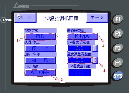 (6) 落料部分如果有料將會被自動頂出落料。 四、系統架構 (1)溫控部分 整個系統的整體統配工作有DELTA的DOPA57BSTD的HMI完成。本機尤為特出的是6臺溫控器的調機工作可以通過HMI的直觀、友好、方便、快捷調機畫面迅速簡單完成極大的方便調機人員,與傳統意義上的溫控表相比有著相當大的優勢。下面為在HMI中組態溫控表調機畫面:  在此畫面中我們明顯可以看出溫控表的調試相當方便,圖中1#標志框可以任意選擇溫控的控制方式;2#標志框用于選擇PID控制方式時P、I、D三個參數的自行整定工作,DTC的P、I、D自整定功能大大節省調試時間,并大大降低了對調試人員的技術要求;3#標志框可以自由選擇傳感器的類型,即使當最終用戶端的傳感器損壞時選擇了不同類型的傳感器也沒有關系;4#標志框在傳感器發生漂移誤差線路損耗時可以通過此參數進行修正,這也充分體現DTC對于工業現場的實際環境有著較強的適應性。其他5塊溫控類似此處不再祥述。 (2)PLC部分 PLC是整個控制系統的核心,進行信號、資料處理,它的性能決定了整個系統的品質。系統選用了毅天系列PLC的ETMX-MSDH32DC-T,此機型具有強大的邏輯處理和數據處理能力以及豐富的周邊指令集。具有相當高的性價比一款機型。 (3)操作界面 人機界面用于參數的輸入和控制命令的發出。系統選用了DOP-A57BSTD,其CPU的高速處理能力,可以實現在線/離線仿真,給用戶一個真正友好、可規劃之輸入界面。 人機上可以調整設備速度(即調整變頻控制的主機速度實現)、當前產量溫度顯示及設置、時間顯示等功能。可以實現手動調整,自動工作(包括上管、對色標、灌裝、封尾及自動落料等工作)。 五、結束語 毅天PLC在灌裝封尾機械上整合解決方案,極大的提升了毅天系列產品在用戶心目中的影象,大大增強了用戶對于毅天產品的信任和信心。實際上,要抓住客戶關鍵在于給客戶提供完整的解決方案,為客戶解決實際問題,不斷滿足客戶的需求,持續改善,才能使客戶成為長久的忠實客戶。