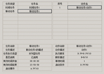 在任務組件運行之后,所有的時間任務和聯動任務便會顯示在組件上。選中某一個任務之后,可以查看該任務的屬性,它包含的動作都會顯示出來,同時可以查看某個動作的屬性。