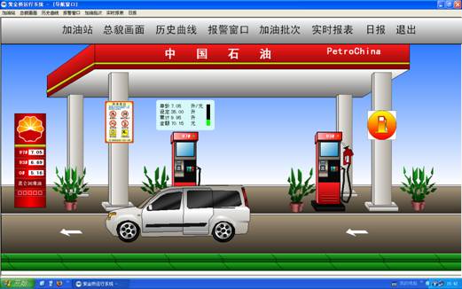 此窗口是示例工程中主要顯示動畫的窗口。在運行環境下,加油站窗口中會有一系列的動作,如汽車移動、加油機狀態顯示、加油數據顯示等。這個畫面中主要用到了紫金橋軟件的動畫連接、窗口腳本等功能。