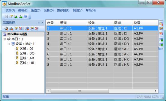 可以使用紫金橋Modbus服務器設置程序的右側的 、 或 來增加、修改或刪除寄存器。