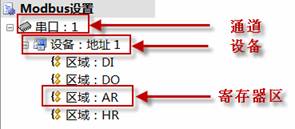 當增加了一個設備之后,該設備就自動地擁有了4個區域,分別是DI、DO、AR、HR區域。它們和Modbus命令的對應關系如下表所示: