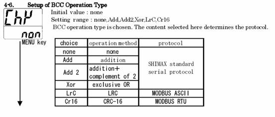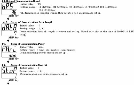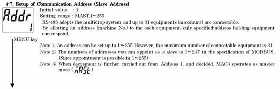 還要對(duì)SHIMAX MAC3系列儀表的通訊參數(shù)進(jìn)行設(shè)定,按住儀表的MENU鍵3s,會(huì)彈出 ,通過向上鍵選到 ,通過MENU一次進(jìn)行如下參數(shù)設(shè)置。