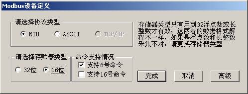 這里協(xié)議類型選擇RTU,存儲(chǔ)器類型選擇16位,支持6號(hào)命令。單擊完成及完成了設(shè)備定義。