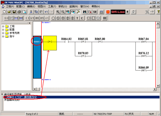 圖 5 自動(dòng)換行 4) 語(yǔ)法錯(cuò)誤的快速定位 快速明了地指示梯形圖中的語(yǔ)法錯(cuò)誤不但節(jié)省了邏輯編輯時(shí)間、提高效率,同時(shí)也便于及早發(fā)現(xiàn)錯(cuò)誤。WinGPC 4.0提供了基于行的自動(dòng)語(yǔ)法檢查,如何非法的邏輯在其行(Rung)標(biāo)號(hào)上會(huì)顯示”e”以表明其有錯(cuò)誤。另外,當(dāng)執(zhí)行語(yǔ)法檢查(Compile)時(shí),出錯(cuò)行及錯(cuò)誤信息將出現(xiàn)在信息窗口,雙擊某條錯(cuò)誤信息能使光標(biāo)在溉錯(cuò)誤處高亮顯示,便于快速定位并修正,見圖 6。