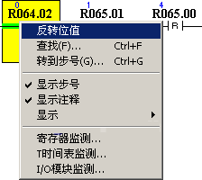 圖 6 快速的錯(cuò)誤定位 5) 調(diào)試功能 技術(shù)人員在現(xiàn)場(chǎng)常常通過對(duì)一些I/O強(qiáng)制設(shè)定數(shù)據(jù)來進(jìn)行邏輯診斷和調(diào)試。WinGPC 4.0為此提供了兩種手段: * 使用寄存器強(qiáng)制功能來設(shè)定值(此時(shí)界面有強(qiáng)制標(biāo)記以表示該值被強(qiáng)制) * 對(duì)位值進(jìn)行反轉(zhuǎn)操作(只要對(duì)其擊右鍵然后選擇反轉(zhuǎn)位值),見圖 7,特別方便臨時(shí)性的操作。
