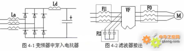 交流電抗器(進線電抗器):串聯在電源與變頻器輸入側之間(如圖4-1中La),進線電抗器的主要作用如下: (1) 降低變頻器產生的諧波,同時增加電源阻抗。 (2) 吸收削弱附近設備產生的浪涌電壓、電流和主電源的電壓尖峰對變頻器的沖擊。 (3) 消弱電源電壓不平衡對變頻器的影響  直流電抗器(平波電抗器):串聯在整流橋和濾波電容之間(如圖4-1中Ld),它的功能主要就是削弱逆變器輸入電流中的高次諧波成份,并且可通過抑制諧波電流來提高功率因數。 2)濾波器; 在變頻器的輸入輸出側電路中,除上述較低次的諧波成份外,還有許多頻率較高的諧波電流,它們將以各種方式形成對其他設備的干擾信號,濾波器就是用于削弱頻率較高的諧波分量的方法(如圖4-2所示)。  輸入濾波器:通常有兩種 (1) 線路濾波器:主要由電感線圈構成(如圖4-2中F11所示)。它主要通過增大線路在高頻下的阻抗來削弱頻率較高的諧波電流。 (2) 輻射濾波器:主要由高頻電容構成(如圖4-2中F12所示,也可以△接方式)。它將吸收掉頻率很高的具有輻射能量的諧波成份。使得流回電源的高頻電流大大減少。(也可以采用變頻器生產廠家提供的專用“無線電抗干擾濾波器”)。  輸出濾波器:也主要由電感線圈構成(如圖4-2中F0所示)。它可以有效地削弱輸出電流中的高次諧波成份,不但起到抗干擾作用,而且能削弱電機中高次諧波電流引起的附加轉矩。 注:當輸出濾波器由LC電路構成時,濾波器內接入電容器的一側,必須與電動機相接。