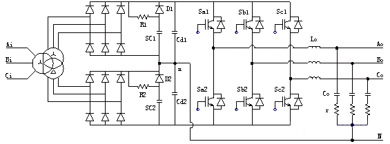 圖中,SC為超級電容(Super Capacitor),R為SC充電電阻,D為SC放電二極管,Cd為直流平波電容器,Sa~Sc為IGBT器件,L0及C0為輸出濾波器的電感和電容。交流輸入側采用Y/Y/