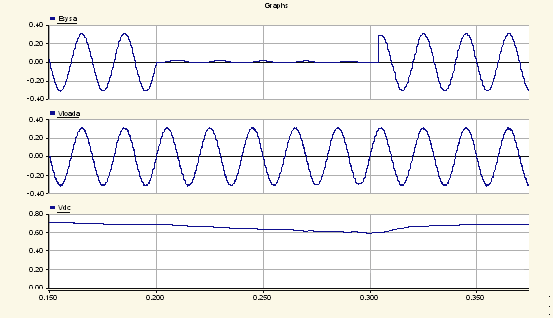 圖2. 系統發生短時供電中斷時,ASD運行的仿真結果 上:系統A相電壓(kV);中:負荷A相電壓(kV);下:直流母線電壓(kV)