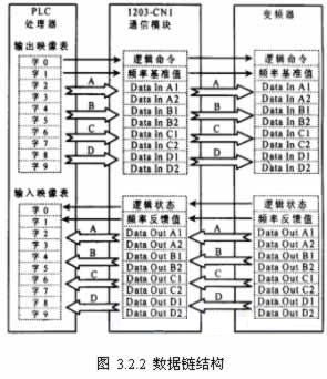 在連接好硬件后,需要利用RSNetWorx軟件對諸如網絡刷新時間、最大預定節點數、非預定節點數以及介質是否冗余等網絡參數進行組態,同時還要組態每個節點,以定義它向主/從網絡發送/接受什么的數據,以及組態節點為主、多主、對等或多信道廣播通信方式。這些工作做好之后,使用RSLinx軟件對重新網絡掃描,可以從界面上看到1203-CN1模塊。為了使變頻器和處理器之間建立良好的數據通訊,需要使用軟件RSNetWorx for ControlNet進行數據組態。 1203-CN1模塊有數據鏈(Datalink)和報文兩種數據結構。因此我們應該按此模塊的數據結構進行數據傳輸,報文結構主要用于對輸入數據或輸出數據不需要連續刷新的情況,因而它適用于對變頻器參數實時監控要求不高的場合。在ControlLogix系統中采用數據鏈結構。其結構如下圖所示: