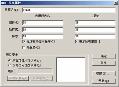 點擊“添加共享”,彈出“DDE共享屬性”對話框。如下圖: