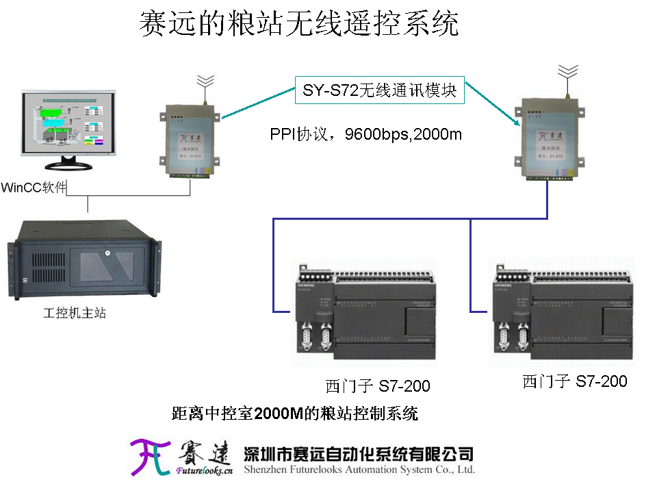 由于控制站和中控室相距從幾百米到2000米,有3個控制站,在中心站這邊,和控制站之間有建筑群體,但通過天線的延伸,可以做到對視。所以,采用賽遠的SY-S72無線PPI通訊站,經過調試,通訊建立,分別和遠程的三個站進行通訊,上位機采用PC access,直接讀取S7-200的數據