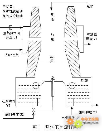 豎爐操作者主要依據經驗知識進行判斷,在此基礎上進行各種手工操作,自動化程度非常低。加上豎爐焙燒過程中包括多種內外因素的交叉變化,不確定性普遍,設備眾多,使得焙燒過程控制變得復雜起來,表現在如下幾個方面: 1) 過程本身具有多變量強耦合的特點,輸入輸出眾多。輸入有空氣量,加熱煤氣量,還原煤氣量等,輸出量有燃燒室溫度,加熱帶溫度,還原帶溫度等,任何一個輸入的變化都可能引起所有的輸出發生波動;2)機理復雜,有物料的進出、熱量的傳遞,還有化學反應,難以對燃燒室的溫度對象建立準確的數學模型,使得基于模型的精確控制理論難以發揮其長處;3)不確定性因素多,如礦石的性質改變,加熱煤氣成分的波動以及操作工水平參差不齊等,這些不確定因素均會影響關鍵工藝參數的穩定性;4) 焙燒過程中往往伴隨著一些故障的發生,一旦操作不當,將會引發生產故障,影響生產的連續性和穩定性。