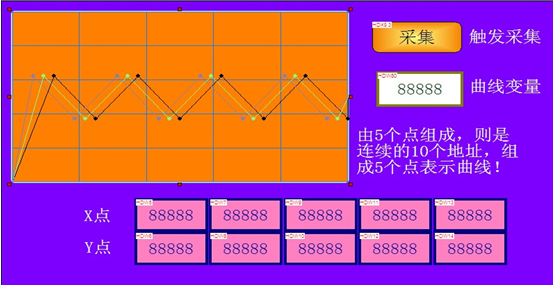 讀取地址設置為HDW5, 點數(shù)為5點。那么HDW5表示第一個點的X軸HDW6表示為第一個點的Y軸.HDW7和HDW8確定第一個點的坐標。第二個點為HDW9和HDW10........第五個點HDW13和HDW14。