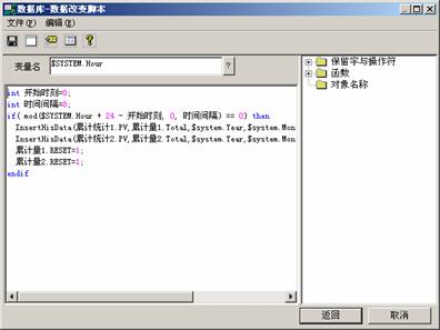 在“數據庫”導航樹中的“腳本/值改變”下建立值改變動作腳本,變量名為“$SYSTEM.Hour”,