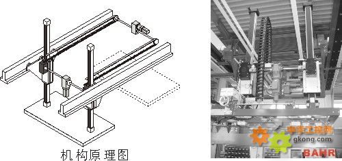 機器人定位系統是整臺設備的核心,為德國bahr公司產品,因運動速度快,而重復精度并不高, X,Y,Z三坐標均選擇為同步齒形帶傳動,單坐標重復定位精度為0.1mm,最快直線運動速度:1000mm/s。其中X坐標軸為兩根長度為3000mm,跨度為2200mm的定位系統ELZ100,由同步傳輸器保證兩根定位系統運動的同步,由一臺3000W伺服電機驅動。出于驅動扭矩及慣量的匹配,需要配一臺行星減速機。
