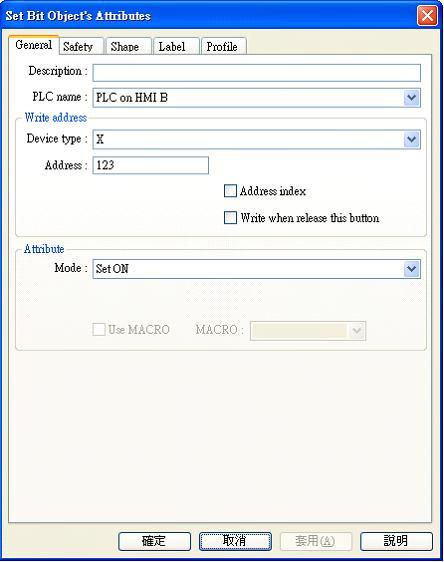 假使現在要使用set bit組件控制HMI B上的三菱PLC, 則只需將組件設定頁中的[PLC name]挑選為“PLC on HMI B”, 即可在PC使用模擬方式, 控制連接在遠程HMI B上的PLC了。