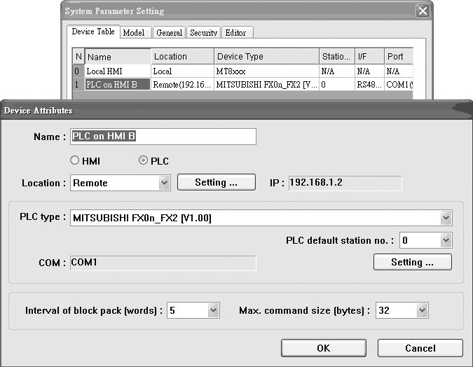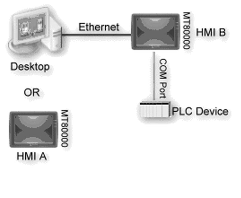 舉例來說,假設現有一臺三菱PLC連接到HMI B的COM 1, 當PC或HMI A欲讀取此臺PLC上的數據, 則PC端或HMI A上所使用工程檔案設定步驟如下: