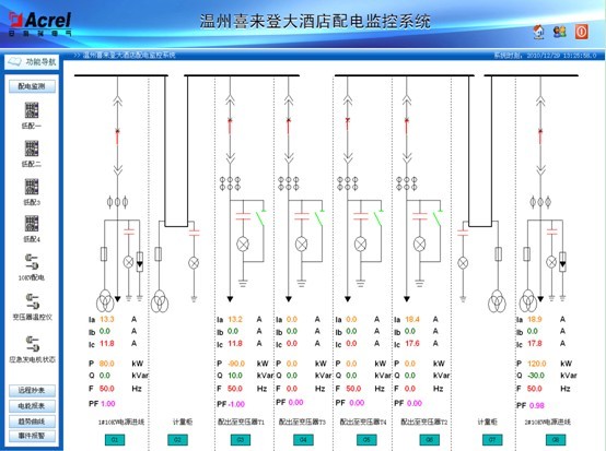 摘 要:介紹安科瑞的智能儀表和ACREL-2000型電力監(jiān)控系統(tǒng)在智能樓宇工程中的應(yīng)用,現(xiàn)場層采用ACR系列及PZ系列儀表采集配電系統(tǒng)各回路電參量,采用ARTU-K32系列多回路遙信裝置采集開關(guān)信號;現(xiàn)場儀表經(jīng)通訊組網(wǎng)后遠(yuǎn)傳至后臺電力監(jiān)控系統(tǒng),通過Acrel-2000型電力監(jiān)控系統(tǒng)實現(xiàn)遠(yuǎn)程遙測、遙信自動化監(jiān)測,從而實現(xiàn)變配電系統(tǒng)的自動化管理。 關(guān)鍵詞:溫州喜來登大酒店 智能儀表 開關(guān)量采集 Acrel-2000 配電監(jiān)控系統(tǒng)