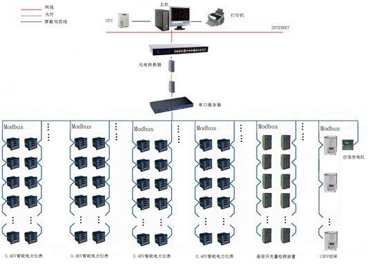 現(xiàn)場設(shè)備層主要的設(shè)備為:多功能網(wǎng)絡(luò)電力儀表、微機保護裝置、變壓器溫濕度控制儀以及應(yīng)急柴油發(fā)電機的控制模塊555。這些裝置分別對應(yīng)相應(yīng)的一次設(shè)備或安裝在電氣柜內(nèi),或安裝在其設(shè)備柜體上。均采用RS485通訊接口,通過現(xiàn)場屏蔽雙絞線進(jìn)行組網(wǎng)通訊,實現(xiàn)數(shù)據(jù)現(xiàn)場采集。 通訊控制層主要為:通訊服務(wù)器,其主要功能為把分散在現(xiàn)場采集裝置集中采集,完成數(shù)據(jù)傳輸協(xié)議的轉(zhuǎn)換后(將RS485轉(zhuǎn)換為RS232)遠(yuǎn)傳至站控層監(jiān)控主機,完成現(xiàn)場層和站控層之間的數(shù)據(jù)交互。 站控管理層:設(shè)有高性能工業(yè)計算機、顯示器、UPS電源、打印機等設(shè)備。監(jiān)控系統(tǒng)安裝在計算機上,集中采集顯示現(xiàn)場設(shè)備運行狀況,以人機交互的形式顯示給用戶。 以上網(wǎng)絡(luò)儀表均在現(xiàn)場均采用RS485接口和MODBUS-RTU通訊協(xié)議,通訊接口是半雙工通信,即通信的雙方都可以接收、發(fā)送數(shù)據(jù)但是在同一時刻只能發(fā)送或接收數(shù)據(jù),數(shù)據(jù)最高傳輸速率為10Mbps。RS-485接口是采用平衡驅(qū)動器和差分接收器的組合,抗噪聲干擾能力增強,總線上允許連接多達(dá)32個設(shè)備,最大傳輸距離為1.2km。