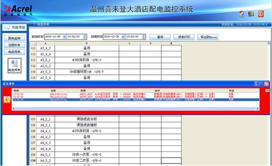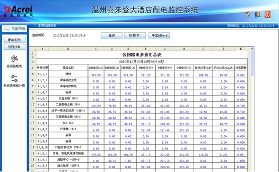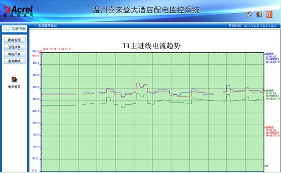 2 系統(tǒng)功能 2.1 數(shù)據(jù)采集與處理 數(shù)據(jù)采集是配電監(jiān)控的基礎(chǔ),數(shù)據(jù)采集主要由現(xiàn)場測控層儀表采集完成,實現(xiàn)遠(yuǎn)程數(shù)據(jù)的本地實時顯示。需要完成采集的信號包括:三相電壓U、三相電流I、頻率Hz、功率P、功率因數(shù)COSφ、電度Ep、遠(yuǎn)程設(shè)備運行狀態(tài)等數(shù)據(jù)。 數(shù)據(jù)處理主要是把按要求采集到的電參量實時準(zhǔn)確的顯示給用戶,達(dá)到配電監(jiān)控的自動化化和智能化要求。 2.2 數(shù)據(jù)庫建立與查詢 主要完成遙測量和遙信量定時采集,并且建立數(shù)據(jù)庫,每隔一定時間將所采集到的實時數(shù)據(jù)存入數(shù)據(jù)庫中,供客戶自行根據(jù)時間查詢。 2.3 歷史數(shù)據(jù)及實時數(shù)據(jù)輸出 當(dāng)客戶查詢數(shù)據(jù)時,可以選擇將報表輸出為一個excel文檔或者直接打印以供存檔。 2.4 故障報警及事故追憶 在配電系統(tǒng)發(fā)生運行故障時,電力監(jiān)控系統(tǒng)會在0.3秒內(nèi)發(fā)出聲光報警提示用戶及時響應(yīng)故障回路,同時自動記錄事件發(fā)生的時間地點,以供用戶查詢,追憶故障原因。 2.5 運行負(fù)荷曲線 定時采集進(jìn)線及重要回路電流負(fù)荷參量,自動生成運行負(fù)荷趨勢曲線,方便用戶了解設(shè)備的實時和歷史運行負(fù)荷狀況。 2.6 網(wǎng)絡(luò)訪問 配電監(jiān)控系統(tǒng)可通過IE瀏覽器進(jìn)行遠(yuǎn)程訪問,方便酒店管理公司在中央監(jiān)控室以外的地方查看和處理配電系統(tǒng)運行數(shù)據(jù)。 2.7 用戶權(quán)限管理 針對不同級別的用戶,設(shè)置不同的權(quán)限組,防止因人為誤操作給酒店運營管理帶來的損失,實現(xiàn)配電系統(tǒng)的安全,可靠運行。 2.8 運行界面