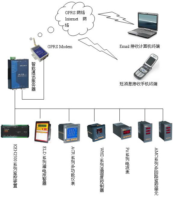 1 基于GPRS箱變遠(yuǎn)程監(jiān)控系統(tǒng)內(nèi)部設(shè)計(jì) 基于GPRS箱變遠(yuǎn)程監(jiān)控系統(tǒng)采用三層網(wǎng)絡(luò)結(jié)構(gòu),如圖2所示,即現(xiàn)場層、通訊層、管理層。現(xiàn)場層主要由智能儀表組成主要完成箱變內(nèi)部電量與非電量的數(shù)據(jù)采集;通訊層主要由智能通訊服務(wù)器、GPRS MODEM組成,主要實(shí)現(xiàn)現(xiàn)場數(shù)據(jù)的集中采集和通訊管理;管理層不設(shè)監(jiān)控中心,主要由移動(dòng)數(shù)據(jù)終端(用戶手機(jī)、email郵箱等)組成,主要用于接收箱變內(nèi)部運(yùn)行數(shù)據(jù);系統(tǒng)借助于移動(dòng)的GPRS網(wǎng)絡(luò)實(shí)現(xiàn)數(shù)據(jù)的遠(yuǎn)程采集和管理。