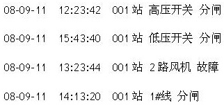 運(yùn)行故障報(bào)警主要為箱變內(nèi)部高壓開關(guān)狀態(tài)實(shí)時(shí)監(jiān)控和變位報(bào)警;報(bào)警內(nèi)容如圖4所示,包括:故障報(bào)警產(chǎn)生日期時(shí)間,站號(hào),回路名稱,報(bào)警內(nèi)容等信息;報(bào)警范圍為高低壓主斷路器實(shí)時(shí)監(jiān)測,故障報(bào)警,變位報(bào)警;饋線斷路器狀態(tài)實(shí)時(shí)監(jiān)測及開關(guān)變位報(bào)警;各饋線回路的漏電報(bào)警;箱變內(nèi)部溫度異常報(bào)警;風(fēng)機(jī)故障報(bào)警;及運(yùn)行電壓的缺相和不平衡報(bào)警等報(bào)警信息組成。該報(bào)警信息主要通過智能元器件對箱變數(shù)據(jù)進(jìn)行實(shí)時(shí)采集、運(yùn)算、通訊上傳至由智能通訊服務(wù)器,再由通訊服務(wù)器進(jìn)行運(yùn)算、分析判斷;最后利用GPRS modem把有效的報(bào)警信息通過GSM網(wǎng)絡(luò)發(fā)送至指定用戶手機(jī);使用戶及時(shí)響應(yīng)故障報(bào)警,縮短故障恢復(fù)時(shí)間。同時(shí)考慮到GSM網(wǎng)絡(luò)繁忙和用戶手機(jī)是否在線等因素,支持報(bào)警信息多用戶,多次間隔發(fā)送。保證信息及時(shí)傳輸至用戶,增強(qiáng)系統(tǒng)運(yùn)行的安全指數(shù)。
