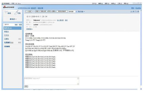 實(shí)時(shí)數(shù)據(jù)監(jiān)測,主要完成對箱變內(nèi)部的實(shí)時(shí)數(shù)據(jù)進(jìn)行監(jiān)測。郵件內(nèi)容如圖5,包括:子站ID號(hào)碼,郵件發(fā)送日期時(shí)間,高低側(cè)遙測:三相電壓,三相電流,環(huán)境溫度,變壓器溫度;低壓進(jìn)線側(cè)遙測:三相相電壓,三相線電壓,三相電流,有功功率,無功功率,功率因數(shù),頻率,吸收有功電度,無功電度,負(fù)荷率,不平衡率;以及饋線回路的三相電流,漏電流等信息。通訊服務(wù)器負(fù)責(zé)數(shù)據(jù)采集、處理和郵件數(shù)據(jù)發(fā)送;由于郵件發(fā)送是采用定時(shí)發(fā)送機(jī)制,為了保證報(bào)警數(shù)據(jù)的實(shí)時(shí)性,因此對實(shí)時(shí)數(shù)據(jù)的采集也是定時(shí)完成的,即在需要發(fā)送郵件之前由通訊服務(wù)器負(fù)責(zé)數(shù)據(jù)的采集,處理,存儲(chǔ);然后編輯郵件進(jìn)行定時(shí)郵件發(fā)送,最終完成實(shí)時(shí)數(shù)據(jù)的遠(yuǎn)程發(fā)送。