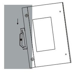 工業以太網交換機安裝方式: 導軌安裝: ①使用配送的導軌座用螺絲扭緊到機器上。 ②UT-6405交換機機器導軌座的上端扣入固定軌道。