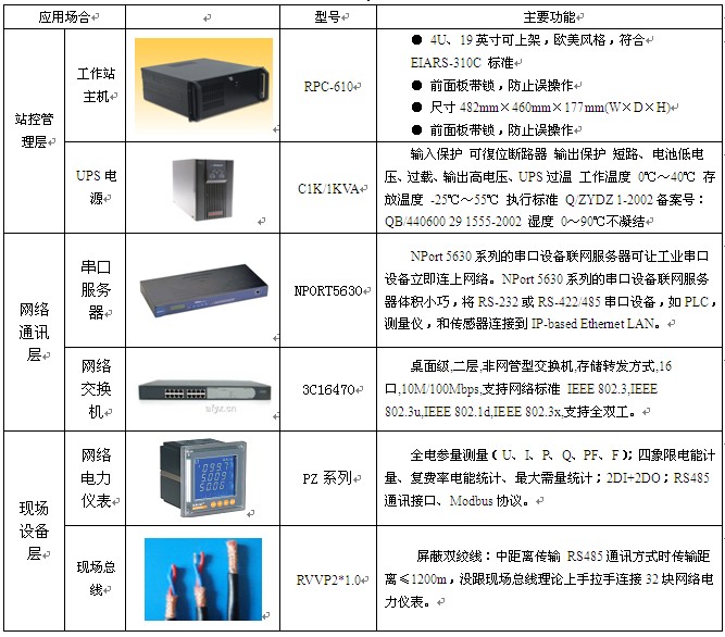 現(xiàn)場設(shè)備層設(shè)備為133臺電力儀表。這些設(shè)備分別根據(jù)設(shè)計要求安裝在相應(yīng)的配電回路上。通過RS-485接口實現(xiàn)與上位機系統(tǒng)的數(shù)據(jù)交互。多功能表和漏電儀表的通訊規(guī)約為Modbus-RTU,保護裝置的通訊規(guī)約為IEC60870-5-103;通訊管理層由2臺Nport-5630串口服務(wù)器和1臺交換機構(gòu)成,實際工程中使用了8個485串口,剩下8個串口備用。串口服務(wù)器將RS-485總線協(xié)議轉(zhuǎn)換為工業(yè)以太網(wǎng)協(xié)議,通過TCP/IP與站控管理層主機相連,構(gòu)建數(shù)據(jù)鏈路。通訊管理層設(shè)備均安裝在電氣值班室的值班人員操作臺中,與站控管理層設(shè)備安裝在一起; 站控管理層設(shè)備為華北工控主機、顯示器、HP打印機以及山特UPS電源,均安裝在電氣值班室的操作臺中。通過安裝在主機上的Acrel-2000電力監(jiān)控系統(tǒng)軟件實現(xiàn)對現(xiàn)場儀表數(shù)據(jù)的采集、處理以及各種人機交互功能,具體設(shè)備如下表: