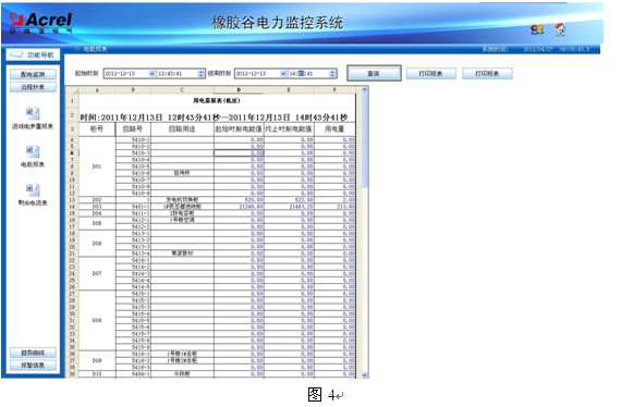 4.3報表功能:通過報表功能可以查詢?nèi)我鈺r刻主要回路的全常規(guī)電參量數(shù)據(jù)、低壓回路的用電量、低壓饋線回路的漏電流值和配電線纜溫度值。用戶主要關(guān)注的是用電量報表和剩余電流報表,用電量報表用于對租戶進行電費收費計量以及與供電局數(shù)據(jù)核對后進行成本核算,如圖3所示;剩余電流監(jiān)測在青島起步較晚,影響用電安全,因此用戶也較感興趣,如圖4所示。