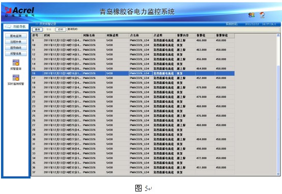 4.4事故報警和追憶:電力監(jiān)控系統(tǒng)定義了所有配電回路過負荷、低壓回路剩余電流過大及10kV回路開關(guān)量變位實時報警和歷史報警查詢等功能,如圖5所示,列表中列出報警發(fā)生和恢復(fù)的時間、回路名稱、回路編號、數(shù)據(jù)點、報警內(nèi)容和報警值等數(shù)據(jù),可見某些回路剩余電流值超標較嚴重。