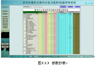 參數抄表功能,主要對低壓各出線回路的電參數進線查詢。支持任意時刻電參數查詢,具備數據導出和報表打印等功能。該報表查詢供兩個變電所4臺變壓器出線各低壓回路的電參數,主要包括:三相電流、有功功率和有功電度及變壓器溫度。該報表各回路名稱和數據庫關聯,方便用戶修改回路名稱。見圖(6)。