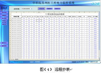 遠(yuǎn)程抄表功能,主要完成對(duì)變壓器進(jìn)線電參數(shù)查詢。支持任意時(shí)刻段電參數(shù)查詢,具備數(shù)據(jù)導(dǎo)出和報(bào)表打印等功能。該報(bào)表查詢供變電所4臺(tái)變壓器進(jìn)線的電參數(shù),主要包括:三相相電壓、三相線電壓、三相電流、有功功率、無(wú)功功率、視在功率、功率因數(shù)、頻率和有功電度。見圖(4)。