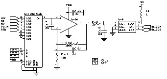 外部模擬量輸入類型有DC 0~20mA、DC 0~10V、PT100、0~100mV、DC 0~1000V,這些外部信號都先經過外部分壓或分流處理調理成同一范圍的電壓信號,然后輸入到一個八選一的模擬開關U44,U44的輸出經過運放U45放大到A/D轉換器U46可接受的電壓范圍,運放U45使用5V單電源軌到軌運放,A/D轉換器使用ADS1110。電路工作時由程序控制將外部模擬信號逐路切換到輸出進行A/D轉換,再由CPU讀取數據(圖8)。