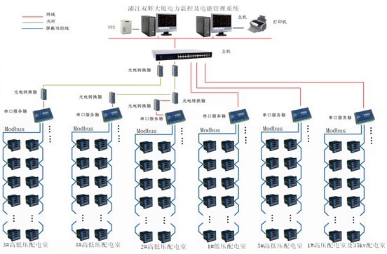 浦江雙輝大廈對高壓部分電力參數(shù)的監(jiān)控和變壓器三相溫度的監(jiān)測的要求比較高,值班室人員一天要6次巡查變壓器溫控儀的溫度和一些電力參數(shù)且變壓器分布于6個不同的變電所里。這樣費(fèi)時費(fèi)力又不能實(shí)時的反應(yīng)一些緊急狀況。低壓部分由600左右的回路組成,如果要抄電能那是一個不小的任務(wù)。使用該系統(tǒng)能夠帶來如下優(yōu)點(diǎn):