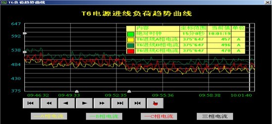 負(fù)荷曲線:定時(shí)采集進(jìn)線回路的電流參量,同時(shí)生成趨勢(shì)曲線(見圖(5)),實(shí)時(shí)了解設(shè)備負(fù)荷狀況,同時(shí)為事故追憶提供依據(jù)。