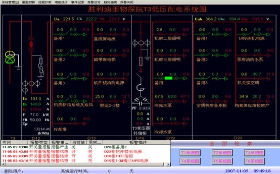 勝利油田物探研究院低壓配電系統(tǒng)主要有6臺(tái)10kv/0.4kv配電變壓器,本系統(tǒng)主要負(fù)責(zé)對(duì)低壓進(jìn)線及相應(yīng)配出回路的實(shí)時(shí)動(dòng)態(tài)監(jiān)控。