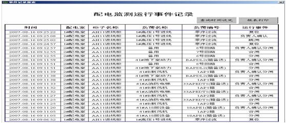 報(bào)表統(tǒng)計(jì)功能:主要完成對(duì)進(jìn)線回路的事件記錄報(bào)表(見圖(2));遠(yuǎn)程抄表(見圖(3))以及用電統(tǒng)計(jì)報(bào)表統(tǒng)計(jì)(見圖(4)),支持時(shí)間查詢及報(bào)表打印輸出。